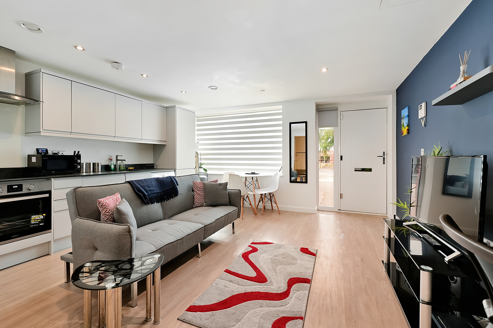 This beautifully designed home features a bright open-plan kitchen and living area complete with sleek, handleless units, integrated appliances, and wood-effect flooring throughout. The lounge is smartly arranged and offers a designated dining space with large front-facing windows allowing natural light to flow in.