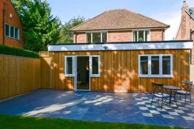 Upstairs, generous bedroom accommodation includes a calm principal suite with en-suite shower room and fitted wardrobes, a second double with its own en-suite and fitted wardrobes, two further bedrooms and a contemporary family bathroom. Outside, the large, level garden features broad terraces and an expanse of lawn framed by mature trees, while a long detached garage provides excellent storage and hobby space.