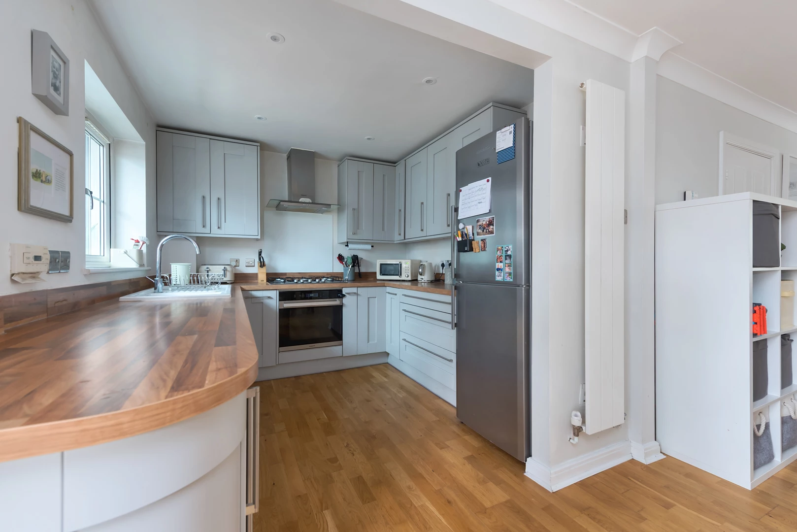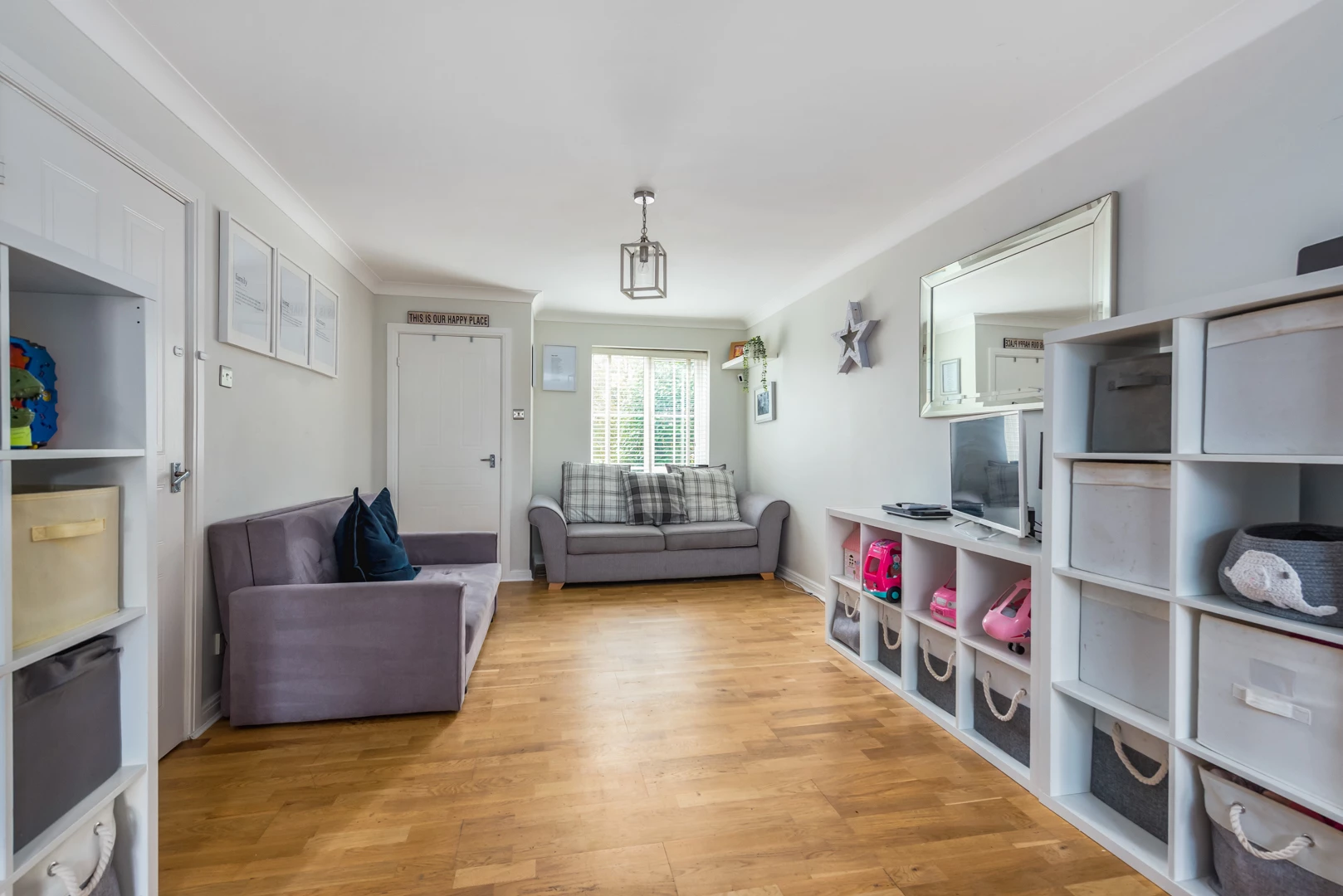Outside, the rear garden is arranged for low-maintenance enjoyment with a broad patio, level lawn and raised planters, all enclosed by modern fencing with side access. A contemporary garden room—currently used as a home office/gym—provides quiet, flexible workspace away from the main house. To the front there is driveway parking and an integral garage for storage. Corfe Way is well placed for local schools, parks and everyday amenities, with convenient access to Farnborough Main station and major routes including the M3 and A331—making this a turn-key home with excellent everyday convenience.