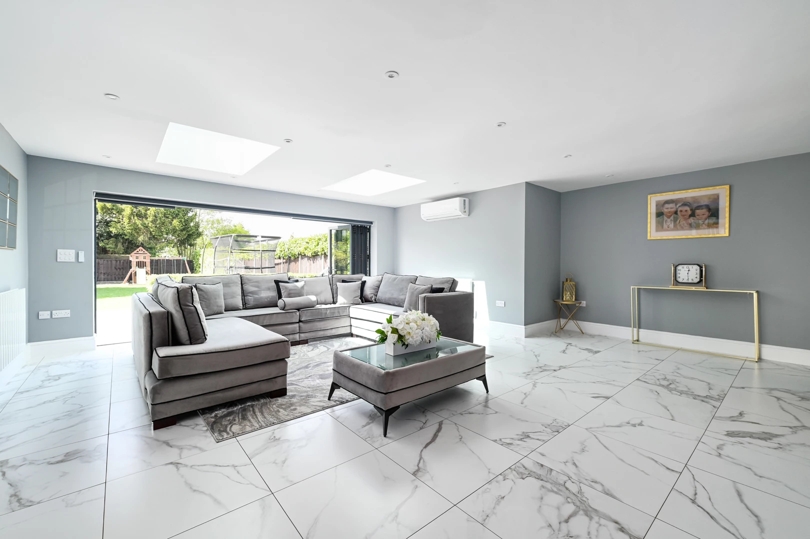 The ground floor which is underfloor heated throughout is centred around an exceptional luxury open-plan kitchen, dining, and family space, finished with sleek granite worktops, elegant marble-effect tiled flooring, a feature central island with breakfast bar, and luxury fittings throughout—including under-cabinet lighting, integrated wine fridge, and brass hardware. A spacious sitting room spans the rear of the house, flooded with light via skylights and wide-format bi-fold doors opening directly onto the raised patio terrace and south-facing garden, creating seamless indoor-outdoor living. There is also a separate reception room ideal as a home office or snug, a utility room, and a guest WC.