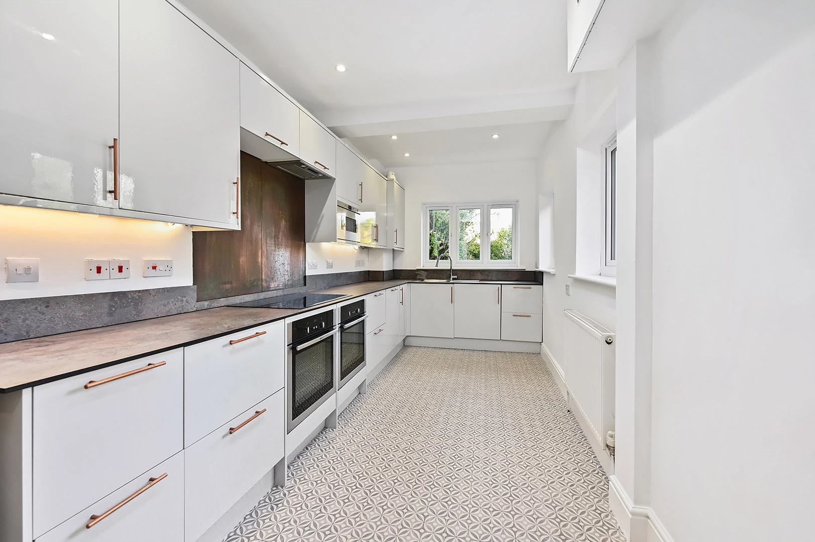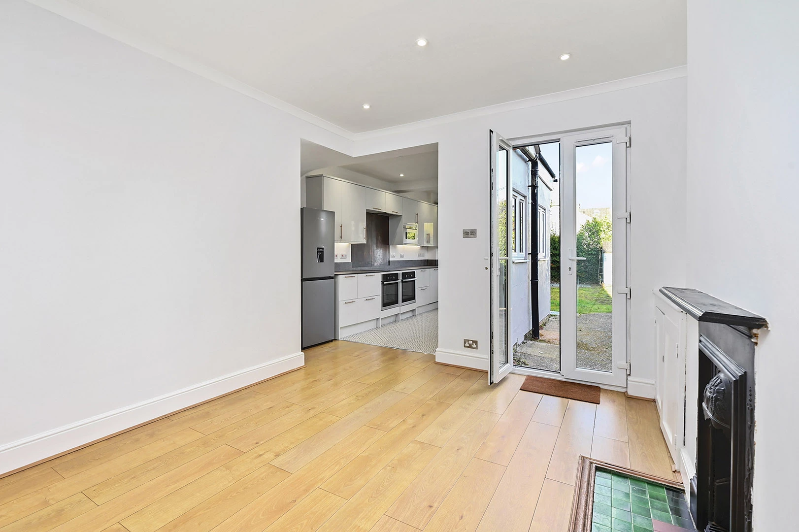 The ground floor offers two generous reception rooms, creating flexible living and entertaining space. The front reception room is full of character with fitted shelving, a feature fireplace and a large bay window, whilst the rear reception room provides an excellent dining/family space with doors opening directly onto the garden and flowing through to a modern fitted kitchen. The kitchen itself is well appointed with a contemporary range of units, extensive work surfaces and integrated appliances, making it both practical and attractive.